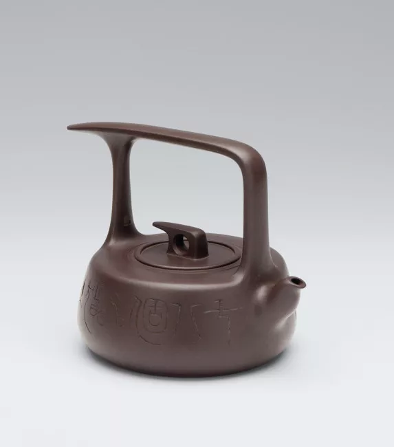 因壺體雙側(cè)雕刻篆書籍“二三點露不可雨,七八個星猶在天”,該壺得名“雨露天星”。其完全造型莊重周正而具備時期氣味,表面明亮,弛勁有力,如共聳立風(fēng)中,氣質(zhì)宏偉;共時又于拙樸中睹纖巧,整把壺呈流線型,遠瞅此壺,好像飛鳥于天。這把壺將直線與曲線接織使用,轉(zhuǎn)變處明快流麗,提梁及蓋的造型安排超過,產(chǎn)生方中有方、方中戴圓、圓中含方的構(gòu)圖;并且壺的光彩紫中泛紅,樸雅高凈。因此,不管將它置于何種情況中品茗參瞅,都能凸顯無限神色和底細。